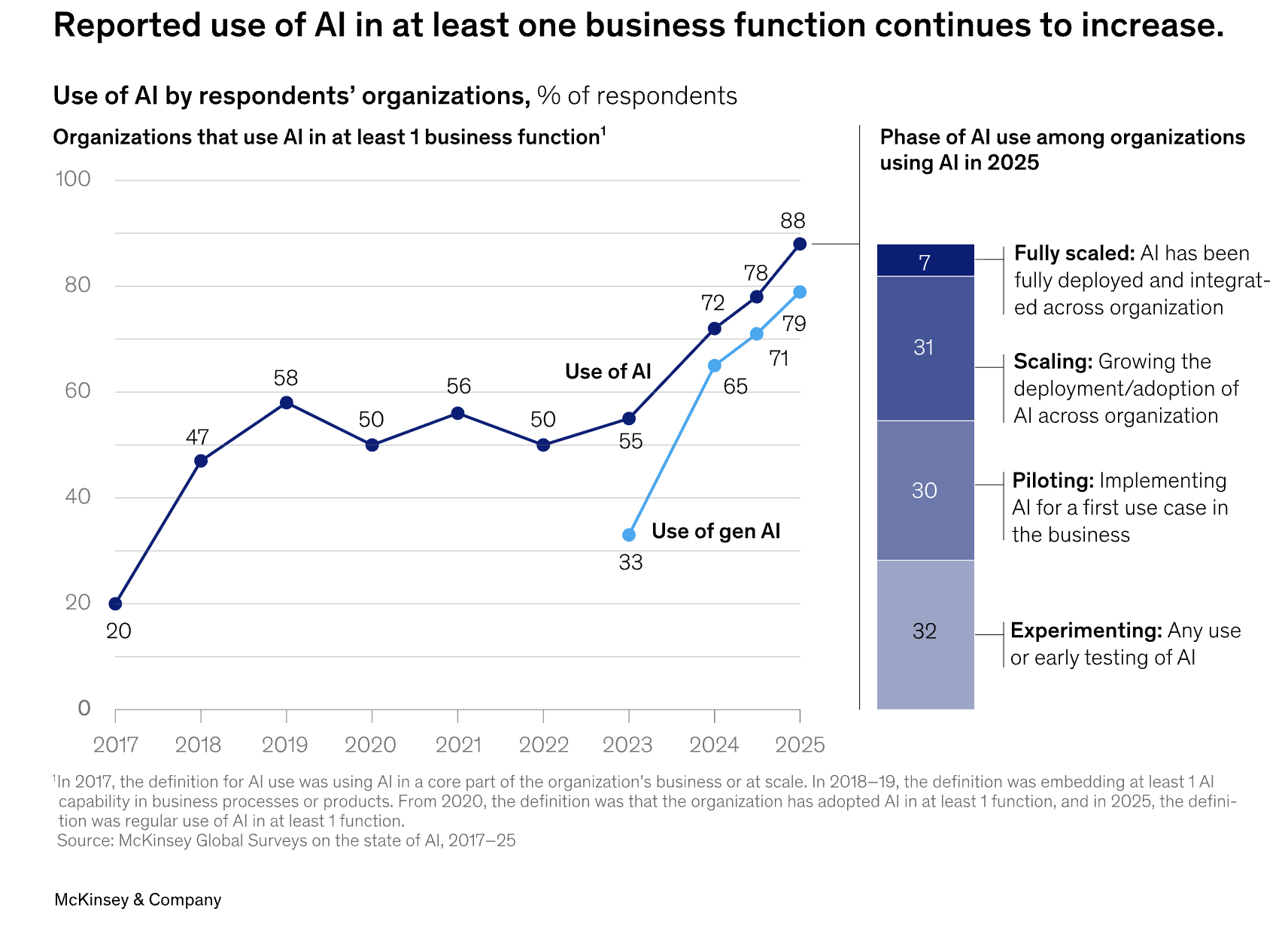 マッキンゼーの調査によると、AIを少なくとも1つの業務領域で活用する企業は88%に達しました。前年の78%から急増し、AIは企業活動の一般的なツールへと定着しつつあります。その一方で全社的にAIをスケールしている企業は3分の1にとどまり、実験やパイロット段階にとどまる企業が多数を占めるといいます。