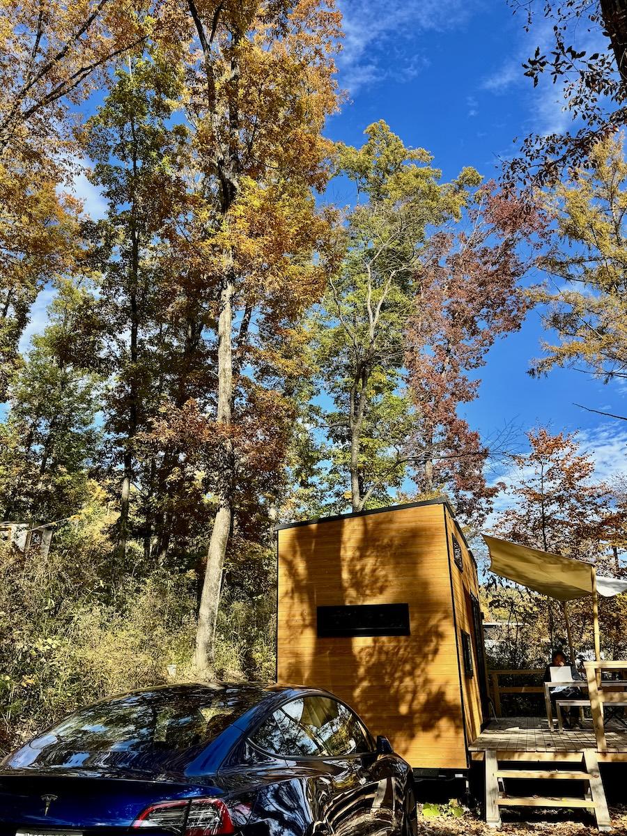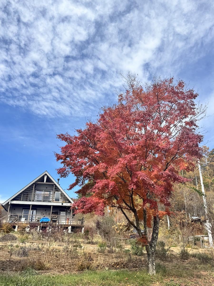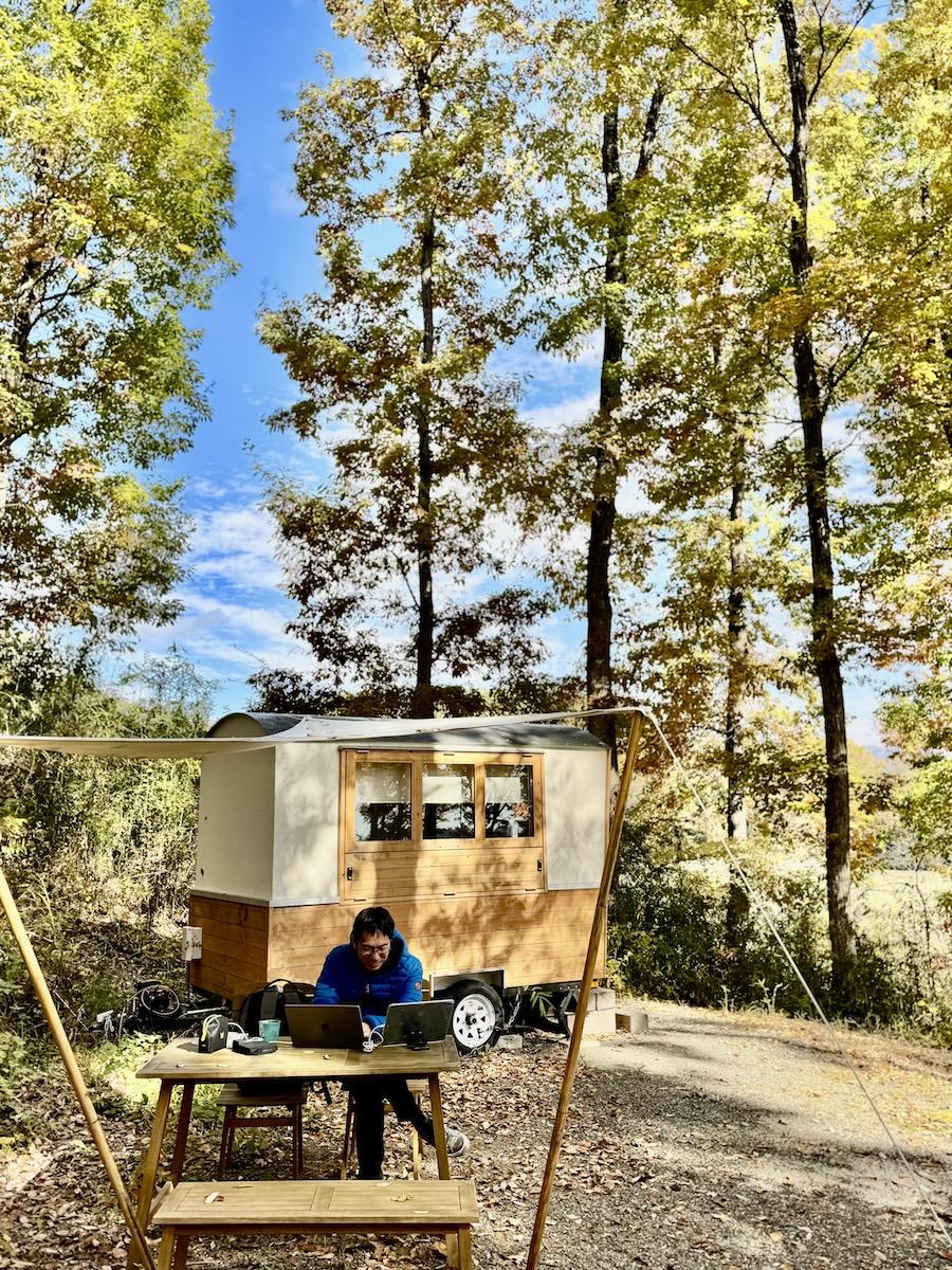個人会員やドロップインでも、この紅葉の下で仕事をしようと、やって来てくれました。籠もって仕事をしたいというので、暖房の効いたトレーラーハウスでのお仕事。この日は、この季節にしては暖かかったので、こうやってテラスで仕事をされていました。