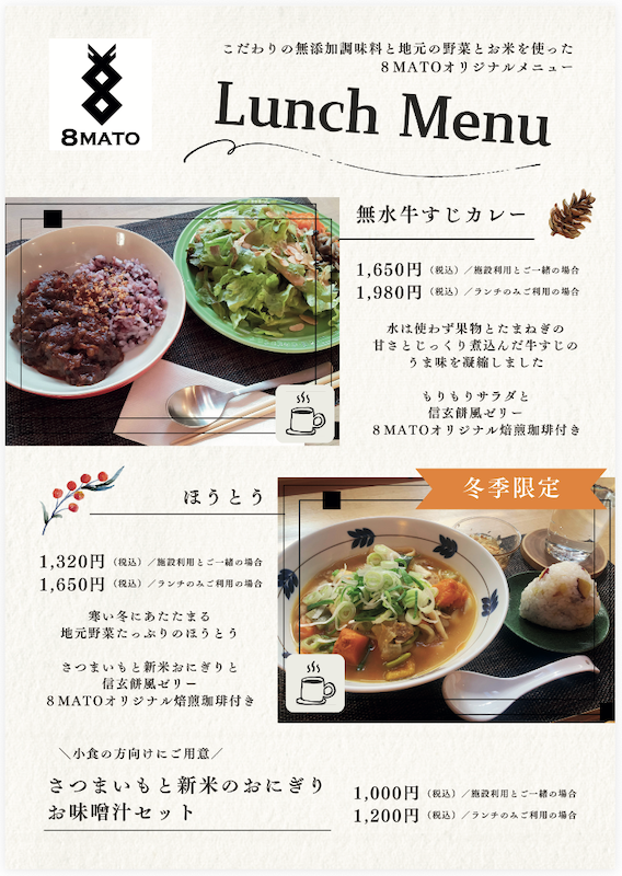 さて、そんな8MATOのランチ・メニューに、甲州名物の「ほうとう」が加わりました。暖まるし、美味しいし、最高です。施設利用者限定となりますが、是非お越し下さい。