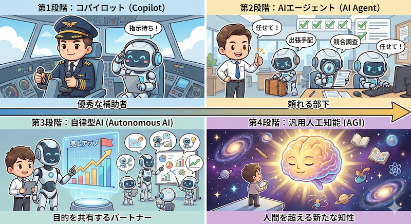 「AIが仕事を奪う」という議論が尽きませんが、AIの進化は一本調子ではありません。AIと人間との関係性は、技術の進歩とともに段階的に変化していきます。 これからの数年、私たちが経験するのは、「コパイロット(Copilot)」から「エージェント(AI Agent)」、そして「自律型AI(Agentic AI)」を経て、「汎用人工知能(AGI)」へと至る進化の系譜です。