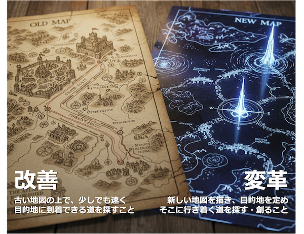 私たちが「変革」に踏み出せないのは、過去の努力や成功体験という「名所」があまりにも心地よく、それを捨てる痛みに耐えられないからです。新しい地図の上で、また一から歩き出し、うまくいくかどうかも分からない道を進むことへの不安。そのコストの高さが、私たちを「改善(今の延長線上でAIを使う)」という安易な道へと逃げ込ませるのです。