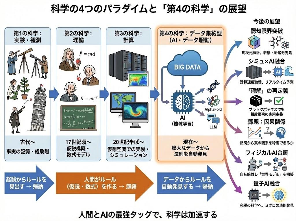 科学の歴史は、「観察」から始まり、「数式」、「コンピュータ」、そして「データ(AI)」へと進化してきました。