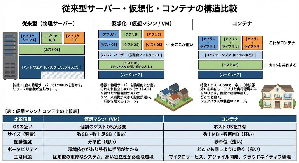 仮想マシンは、それぞれが独立した「ゲストOS(WindowsやLinuxなど)」を持っています。そのため、1台の物理サーバー上で全く異なるOSやシステムを同時に動かすことができ、隔離性が高く安全です。しかし、仮想マシンを立ち上げるたびに重たいOSを起動する必要があるため、起動に時間がかかり、メモリやストレージの消費量も大きくなるという弱点がありました。例えるなら、広大な土地にそれぞれ基礎から「一軒家(ゲストOS)」を建てるようなもので、しっかりしていますが手間とコストがかかります。