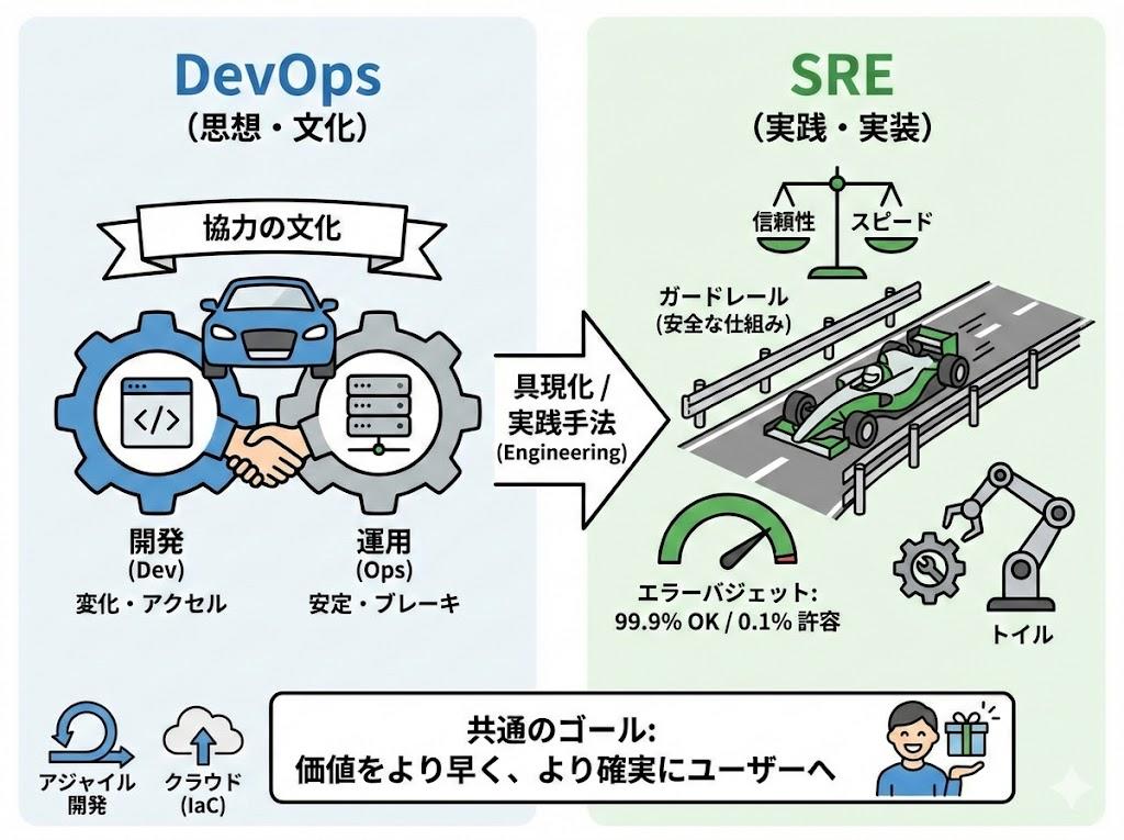 DevOpsは、ビジネス価値を最大化するための「企業文化・戦略」であり、SREはその文化を具現化するための「実践手法」です。