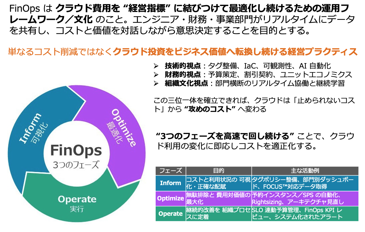 「Finance(財務)」と「DevOps(開発と運用の連携)」を掛け合わせた造語であり、IT部門(エンジニア)、財務・経理部門、そして事業部門が一体となって、クラウドコストの最適化を目指す組織文化や実践手法です。