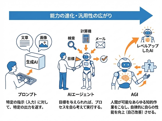 これまでのAI技術の進化は目覚ましいものがありますが、現在のAIはまだAGIの域には達していません。では、私たちがすでに活用している「生成AI」や、近年注目を集める「AIエージェント」と、AGIは具体的に何が違うのでしょうか。