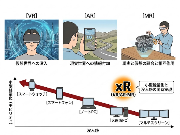 これらxRデバイスがもたらした最大のパラダイムシフトは、「モビリティ(小型軽量化)」と「没入感」という、相反する2つの要素(トレードオフ)を完全に解消した点にあります。これまでのIT機器の歴史において、スマートウォッチやスマートフォンのように持ち運びやすさを追求して小型化すれば、画面は小さくなり没入感は大きく低下しました。逆に、マルチスクリーン環境や大型モニターのように高い没入感を得ようとすれば、機器は巨大化し特定の場所に固定せざるを得ません。しかし、近年のxRデバイスは、頭部や顔に装着できるほど劇的な小型軽量化を達成しながら、ユーザーの眼前に無限に広がる仮想スクリーンや三次元空間を展開することで、かつてない圧倒的な没入感を同時に実現したのです。