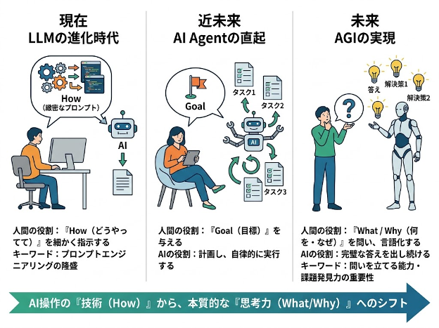 これからの時代は、AIに対して「どうやって作業を進めるか(How)」を細かく指示するスキルから、「何を解決したいのか(What)」、「なぜそれが必要なのか(Why)」を明確に言語化するスキルへと、ビジネスパーソンに求められるコア能力がシフトしていきます。プロンプトエンジニアリングという技術の陳腐化は、私たち人間がより本質的な「思考の深さ」と「課題発見力」を問われる時代の幕開けを意味しているのです。