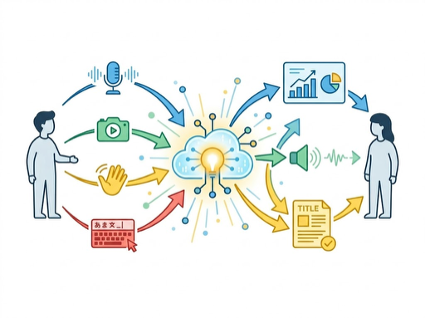 UUIの基盤となるのが、複数の情報伝達手段(モダリティ)を組み合わせて処理する「マルチモーダルAI」の進化です。これにより、テキストだけでなく、音声、画像、動画、さらにはジェスチャー(動作)などを組み合わせて、AIに自分の意図を伝えることが可能になります。