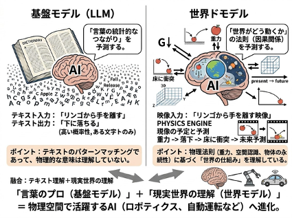 一方、世界モデルは、膨大な視覚情報(動画など)や行動のデータから「世界がどう変化するか」を学習し、シミュレーション(予測)する能力を持ちます。つまり、「こう動いたら、環境はこう変化するだろう」という頭の中の模型をAI自身の内部に持っているのです。