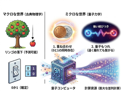 私たちが生活する日常の世界(マクロな世界)は、ニュートン力学に代表される古典物理学の法則に従って動いています。投げたボールの軌道は正確に計算でき、物質の状態は明確に決まっています。古典コンピュータもこの物理法則の上に成り立っており、情報を「0」か「1」のどちらか確定した状態で処理します。