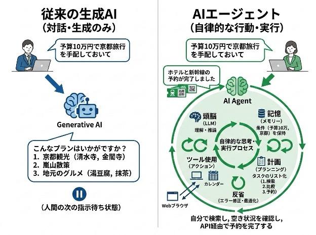 これに対し、AIエージェントは「自律的に行動する」AIです。生成AIを「高度な頭脳」としてシステムの中核に組み込み、与えられた目標を達成するために自ら計画を立て、必要なツールを使いこなし、試行錯誤しながらタスクを完遂します。