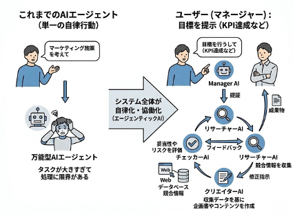 マルチエージェントの環境下では、AI同士が自律的に対話し、議論し、フィードバックを与え合いながらタスクを進めます。リサーチャーAIが集めたデータをもとにクリエイターAIが素案を作り、チェッカーAIが「このデータは古い」「法的なリスクがある」と指摘すれば、再びリサーチャーAIが最新情報を探しに行き、クリエイターAIが修正する。このような協働と試行錯誤のプロセスが、人間を介さずに全自動で行われます。