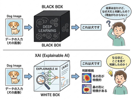 もし、AIが「この患者はガンである」と診断したり、「この顧客の融資審査を否決する」と判断したりした場合、その理由が分からなければどうなるでしょうか。医師は自信を持って治療方針を決定できず、銀行は顧客に対して納得のいく説明ができません。医療、金融、あるいは自動運転など、人命や財産、人権に関わる重大な意思決定において、根拠の分からない「ブラックボックス」の判断を鵜呑みにすることは非常に危険です。そこで、AIの判断を「人間が理解・納得できる形」にするために登場したのが、「XAI(Explainable AI:説明可能なAI)」です。