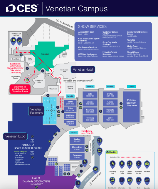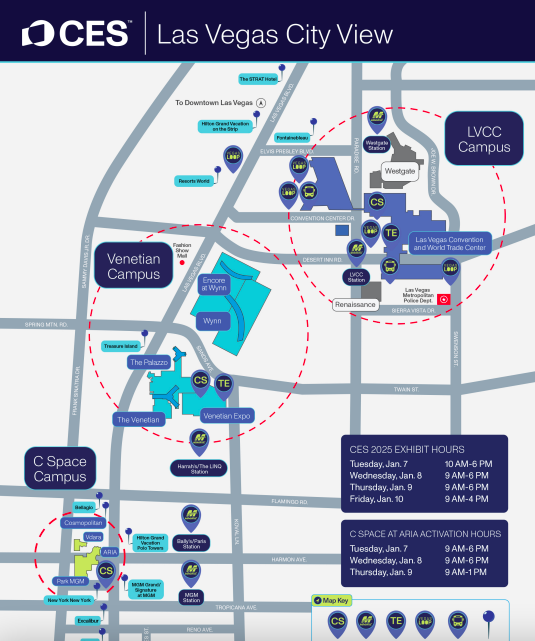 まず、CES 2026の展示会場は 「3つのキャンパス(会場群)」 に分かれており、いずれも展示面積・会場規模が極めて大きく、単なる「1つのホールを回る」以上の規模感です。