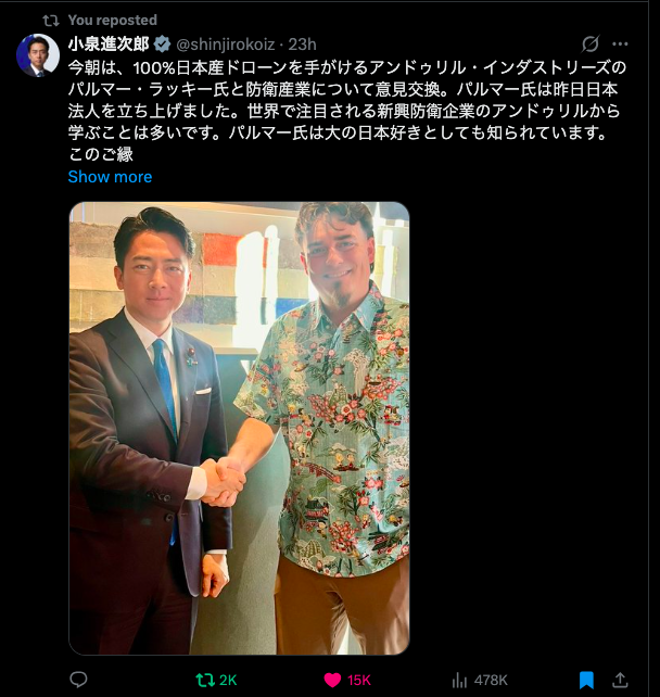 昨日流れてきた以下の写真には「おお!」となりました。小泉防衛大臣と、かのアンデュリル(Anduril)CEOのパルマー・ラッキー氏が握手しているではありませんか。