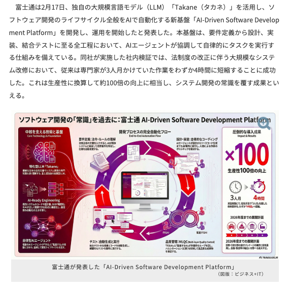 富士通の「AI-Driven Software Development Platform」と独自LLM「Takane(タカネ)」を武器にした戦略は、単なる「ツール導入」の域を超え、日本のSI(システムインテグレーション)業界の構造そのものを破壊・再定義する、極めて攻撃的なものになると予想されます。