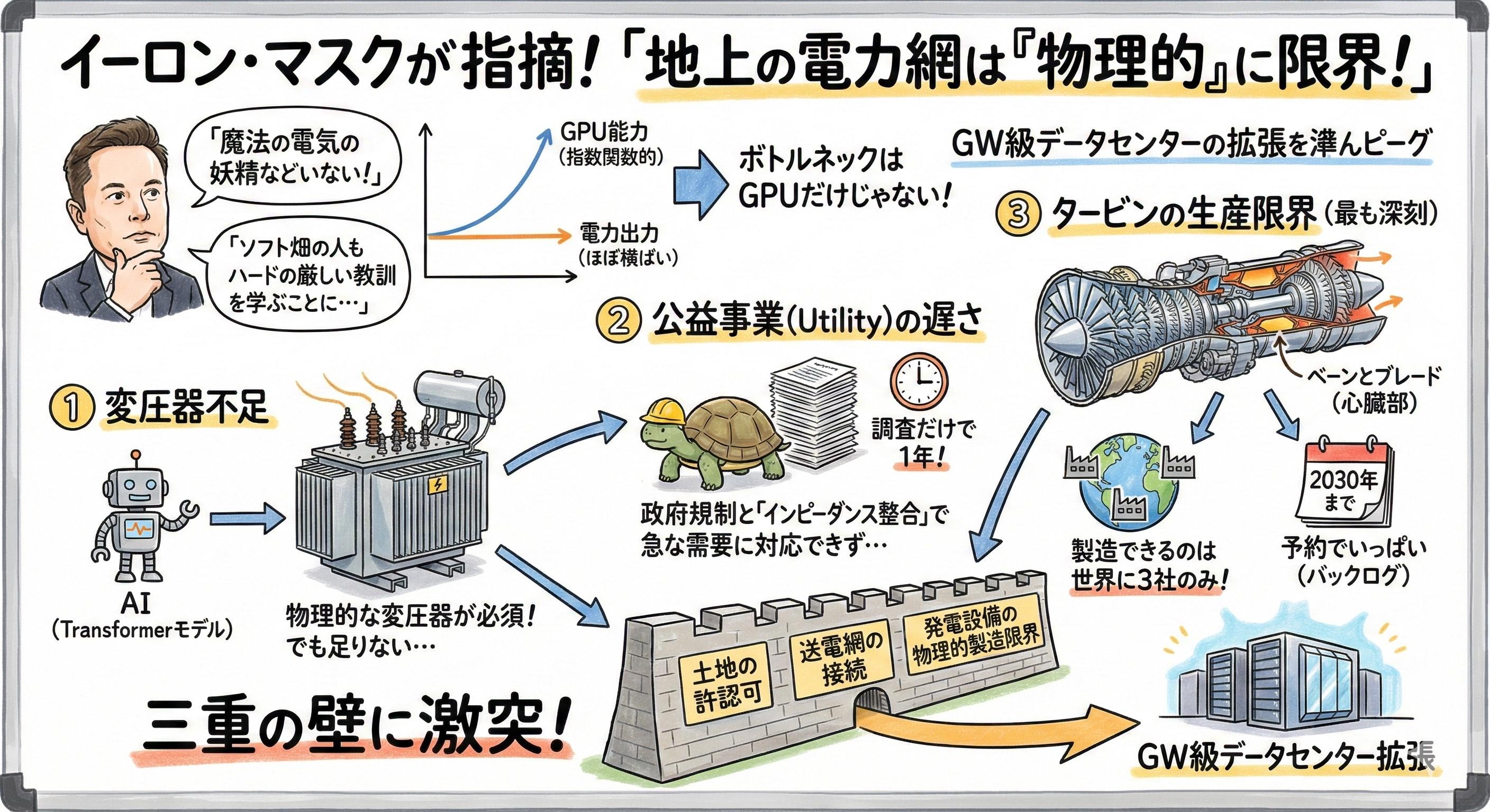 つまり、地上でギガワット級のデータセンターを拡張しようとすると、土地の許認可、送電網の接続、そして発電設備の物理的な製造限界という「三重の壁」に激突するのです。