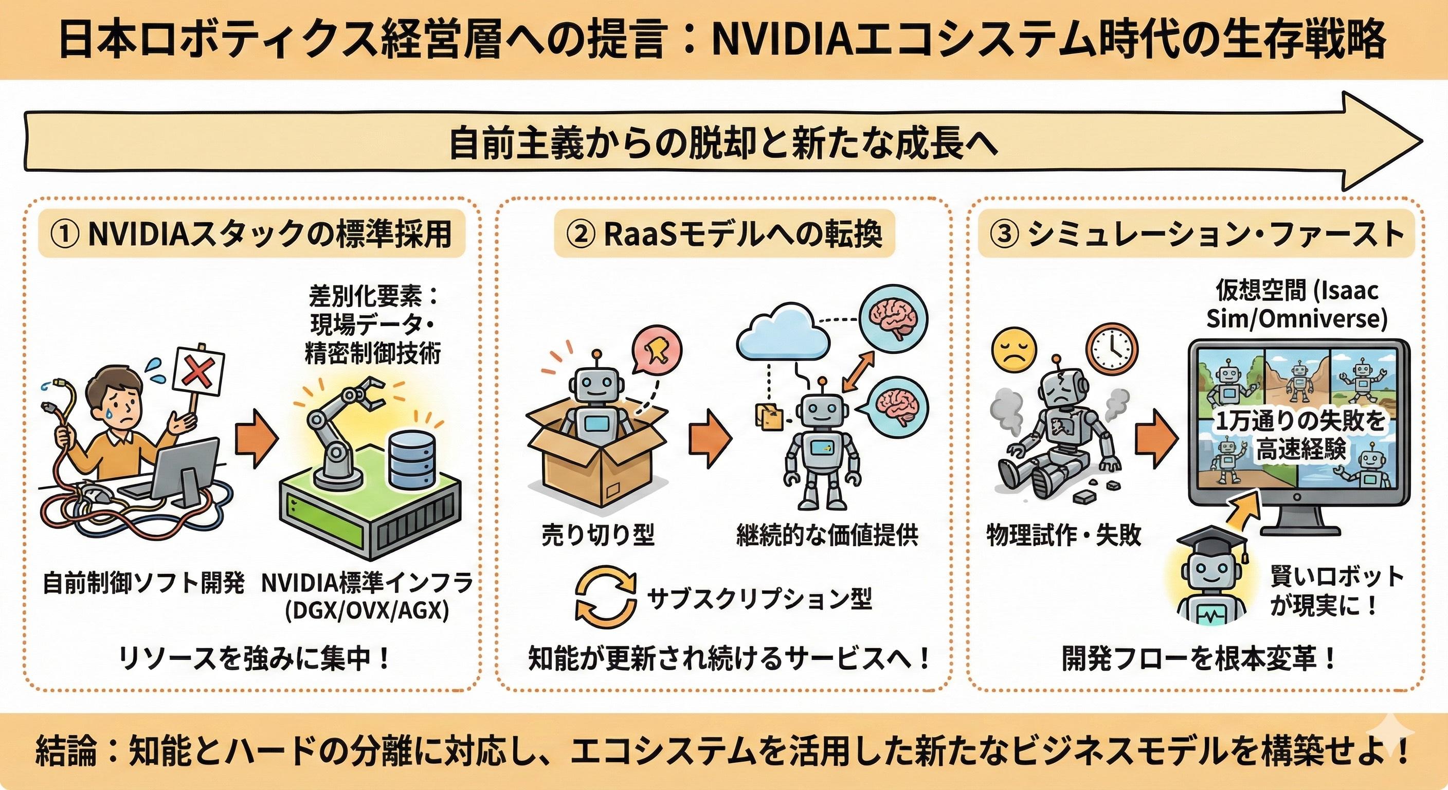 「自前主義」からの脱却とNVIDIAスタックの標準採用: 独自の制御ソフトの開発にリソースを割くのではなく、NVIDIAのDGX/OVX/AGXを標準インフラとして採用し、その上で自社独自の「現場データ」と「精密制御技術」を差別化要素として磨き上げること