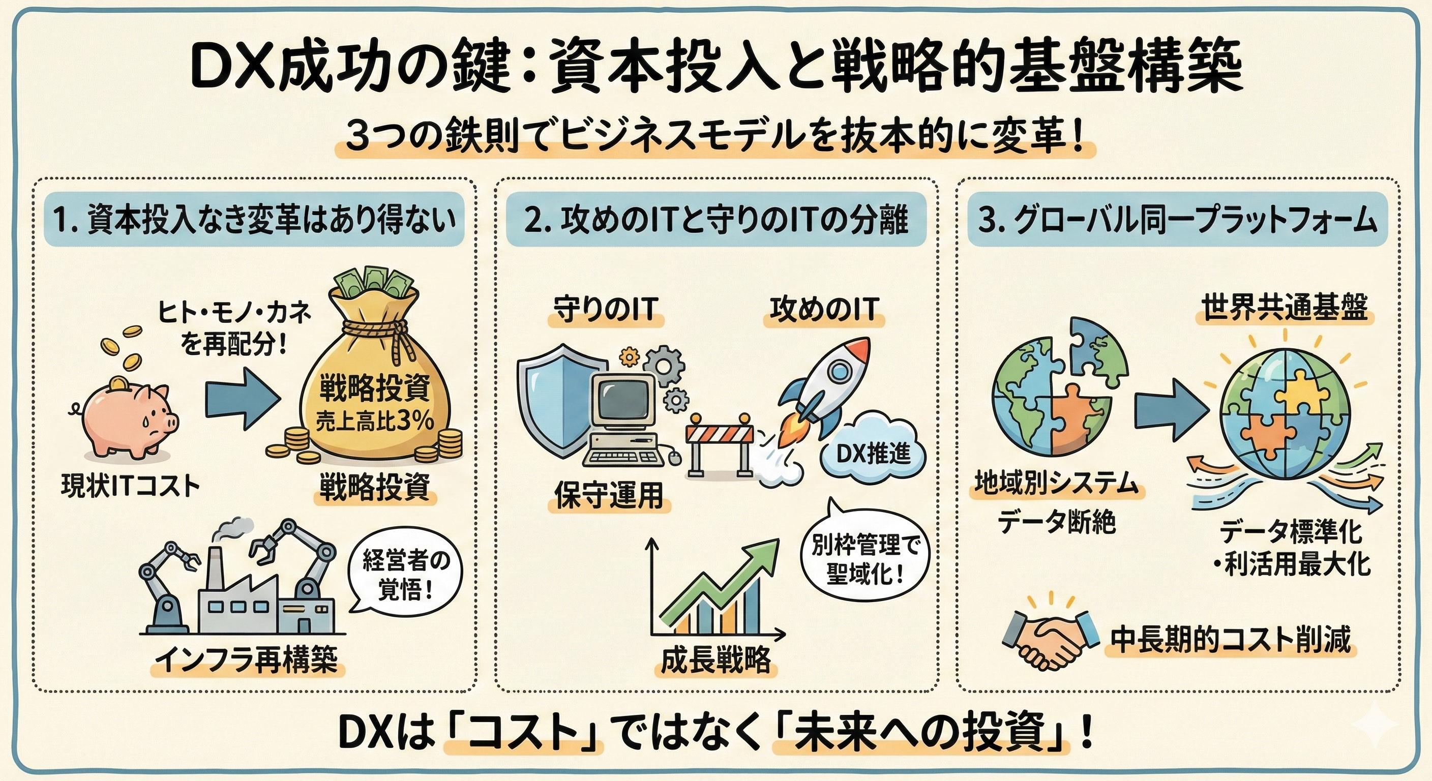 DXとは、既存の「ヒト・モノ・カネ」の配分を、データとテクノロジーを軸に抜本的に組み替える行為である。ユニクロが1,000億円を投じて物流を自動化したように、資本を投下して物理的、デジタル的インフラを再構築しなければ、現場の意識改革だけでビジネスモデルが変わることはない。経営者は、DX予算を「ITコスト」ではなく、「事業存続のための戦略投資」として位置づけ、売上高比3%を基準値として確保すべきである。