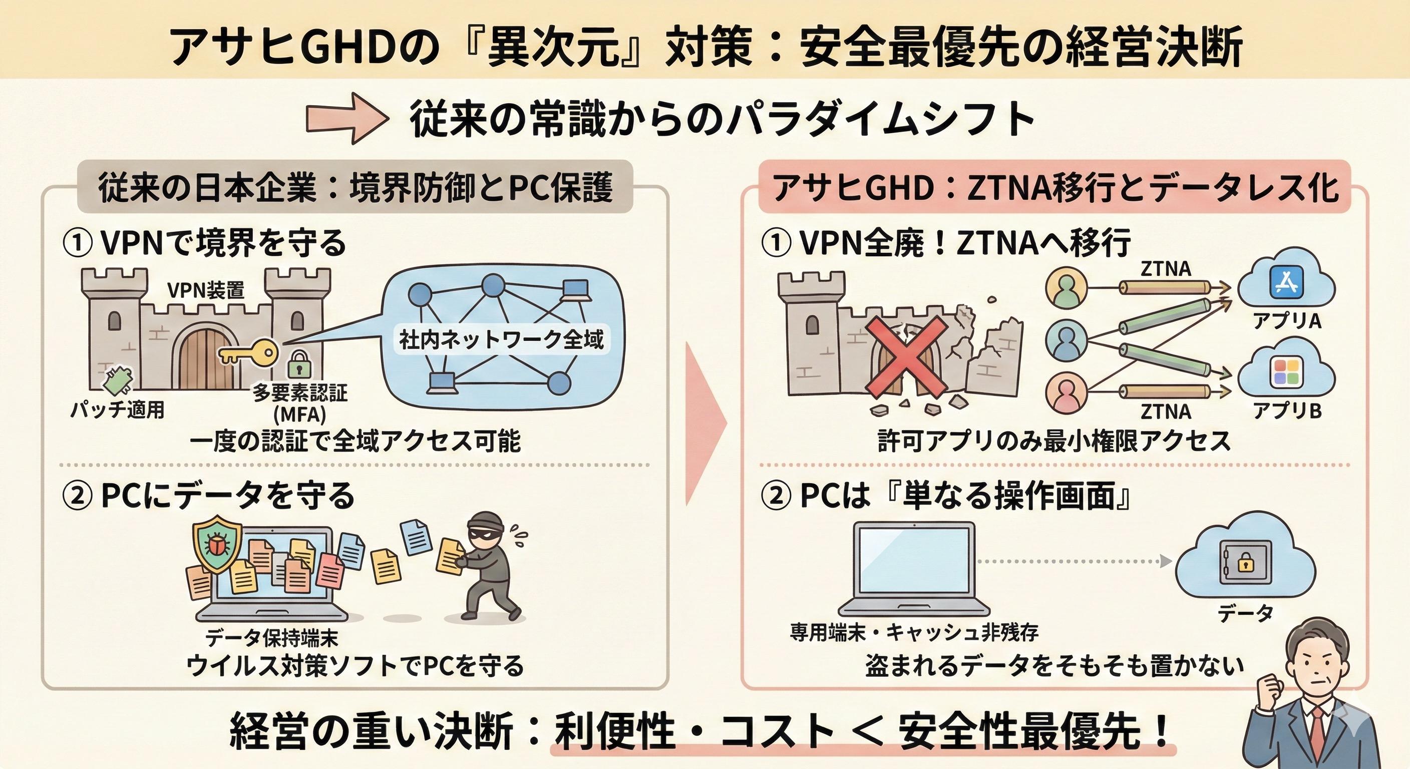 違い: 従来の対策は「PCにウイルス対策ソフトを入れる」だけでした。アサヒGHDは「そもそも盗まれるデータをPCに置かない」アーキテクチャに変更しました。