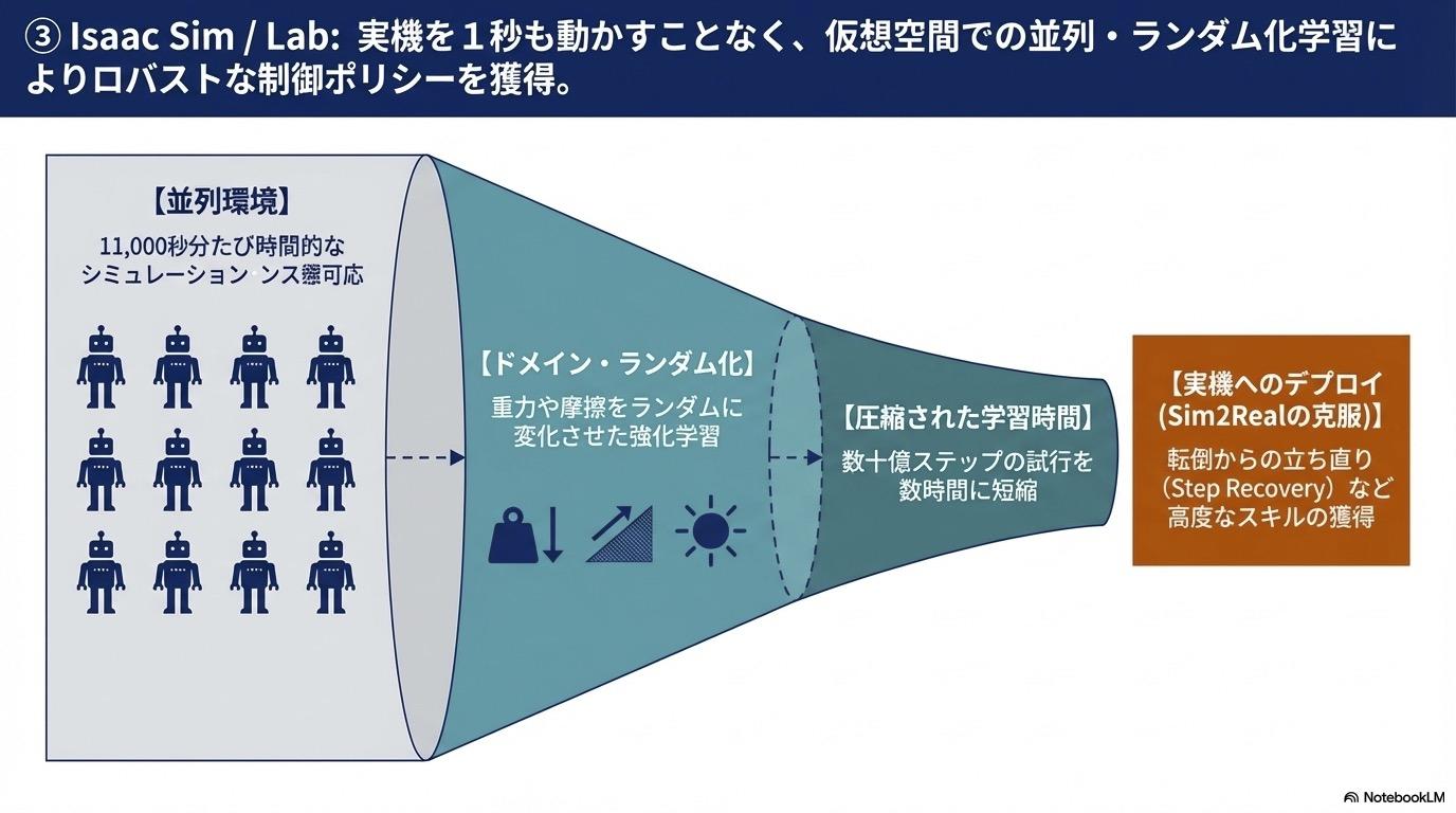 1. 運動皮質の訓練(Isaac Sim / Isaac Lab) SharpaWaveは、NVIDIAのIsaac LabやIsaac Sim(末尾のスライド参照)と完全な互換性を持つオープンソースのソフトウェアスタック上で動作します。これにより、仮想空間上で数十億ステップに及ぶ強化学習(RL)を並列実行し、複雑な物体操作スキルを高速に獲得しています。
