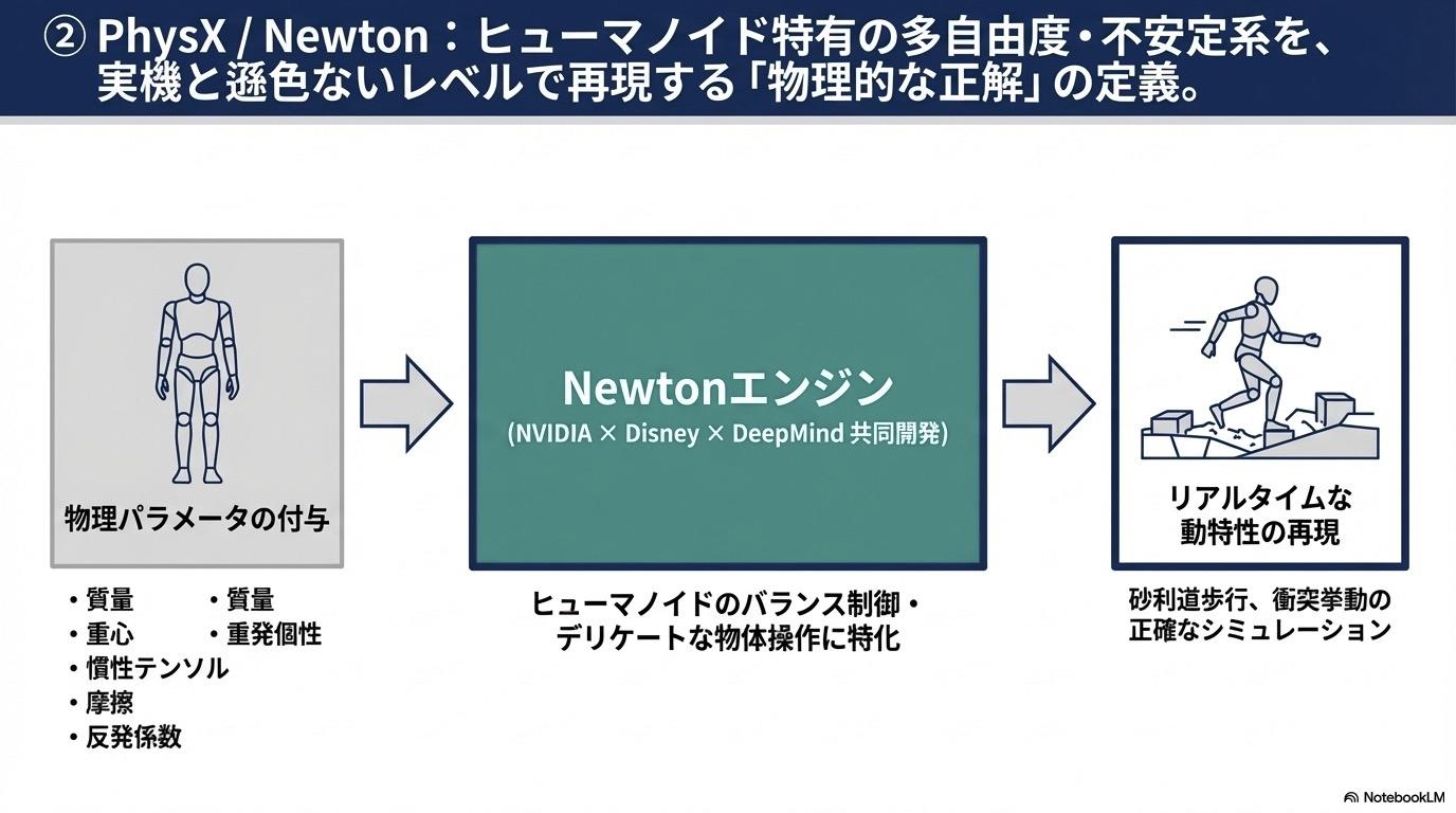Sim2Realの差分: シミュレーション上の理想的な物理挙動と、現実の摩擦・ノイズ・遅延の相関関係。