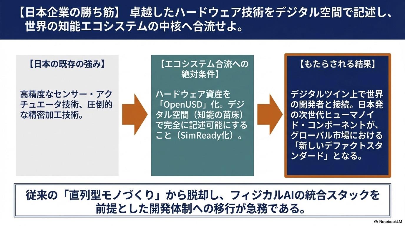 ソフトウェアの共通化: Sharpaは、自社のハードウェアをIsaac SimやMuJoCoで即座に動かせる「SimReady」な状態で提供することで、世界中のトップ研究者が自社製品を真っ先に採用する環境を整えました。(今泉注:シンガポールSharpa社はNVIDIAスタックで開発する世界中のヒト型ロボット開発企業に対してSimReadyな"部品"としての手SharpaWaveを提供することで、同社の手が世界のデファクトスタンダードになることを狙っている。世界中のロボット開発者はドラッグ&ドロップでSharpaWaveを自社ロボットの"手"にすることができる。NVIDIAスタックで開発しているとそれができる)