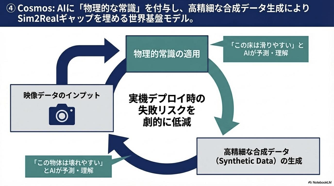 世界の理解(Cosmos的アプローチ): CraftNetは、NVIDIAのCosmos(末尾のスライド参照)が担うような「世界の物理的予測」を触覚レベルで実行します。指先の1,000個以上の触覚ピクセル(Dynamic Tactile Array)から得られる情報を、AIが「見て、感じる」ことで、卵の殻を剥くような極めて繊細な接触を可能にしています。(今泉注:シビれます)