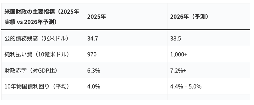 財政の健全性を測る指標である「利子率と成長率の差(r-g)」は、2026年に危険な領域に突入した。借入コスト(r)が経済成長率(g)を恒常的に上回る状況では、債務対GDP比は自動的に上昇し続ける 。2026年時点での米国の財政赤字はGDPの約6%に達しており、これをファイナンスするためにさらなる国債発行が必要となるが、市場はその受け皿としての能力を失いつつある 。