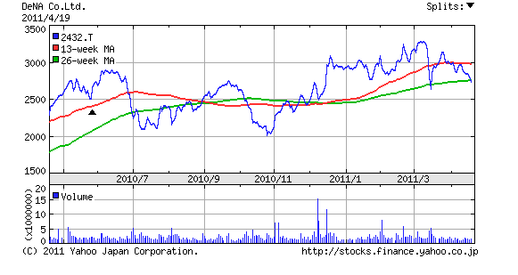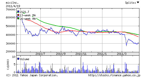 その次は、DeNA、グリーとmixiの株価の推移の違いを比較したい。