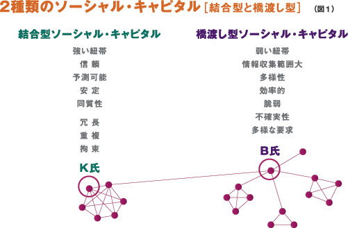 「ボンド・キャピタル」と、広く社会における対人関係から生まれる「ブルッジ・キャピタル」がある。震災などで地方のある特定地域が被害にあった場合に