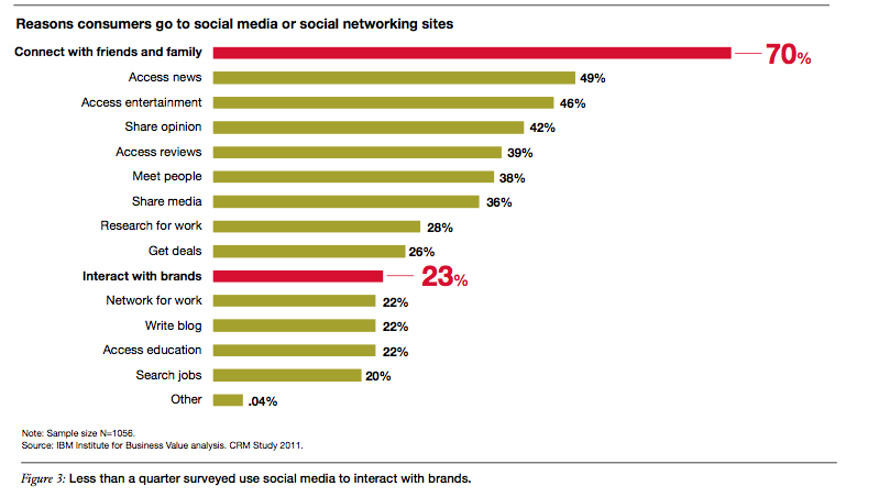 まず、ソーシャルメディアを活用する理由は、友達や家族とつながるためが70%、企業とインタラクションするためは23%に過ぎません。