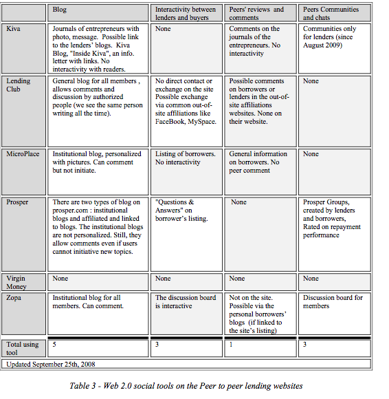 ① ブログをもっているか、②貸し手と借り手の間のインタラクションを生み出しているか、③レビューやコメント機能をもっているか、④コミュニティやチャット などのやりとりがあるかを示したものです。
